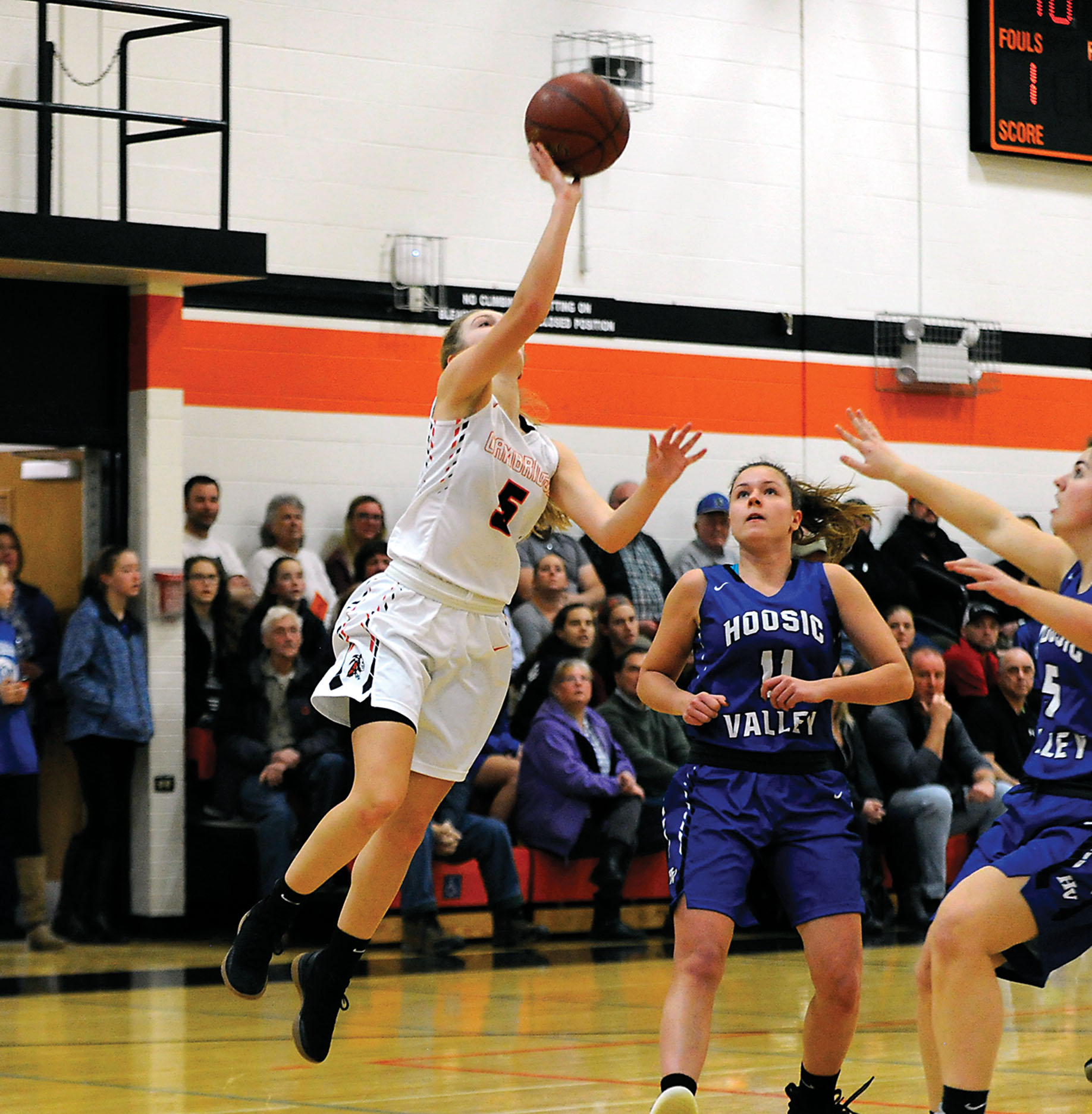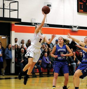 Friday, 1/18. Fifth ranked in NYS Hoosic Valley visited the sixth ranked Cambridge Indians last Friday evening. The Valley Indians scored first, a three-pointer that gave them the lead. That 30 second, three point lead would turn out to be the highlight of the night for them. After a Cambridge three tied it up at three all, the Valley never led again. By the end of the first half, Cambridge held a 40-16 lead and Hoosic Valley was rattled to its toes and never recovered. Cambridge sophomores Sophie Phillips scored 22 points and twin sister Lilly added 20. Alex Rifenburg scored 14 for Hoosic Valley.