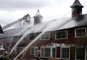 The blaze broke out shortly before 1 pm on Tuesday, April 30 in one of the oldest buildings on the Bennington College campus, called The Barn. The two-story U-shaped structure, which dates back before the college was opened in 1932, housed both classrooms and offices. School officials said everyone escaped safely, although one firefighter from Shaftsbury, VT received minor injuries. He was treated at Southwest Vermont Medical Center and released.