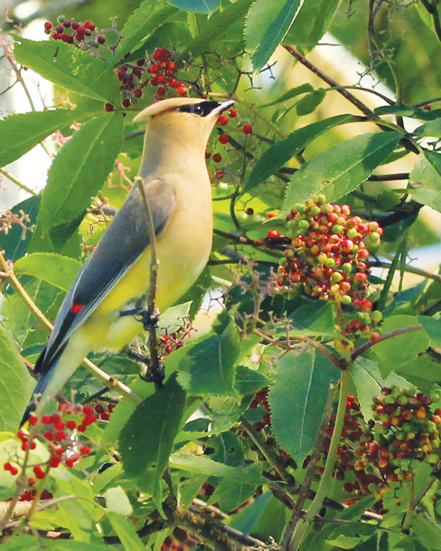This Cedar Waxwing bird (Bombycilla cedrorum) is eating the berries from a Red Elderberry bush (Sambucus racemosa) on a Petersburgh lawn near the edge of the woods.