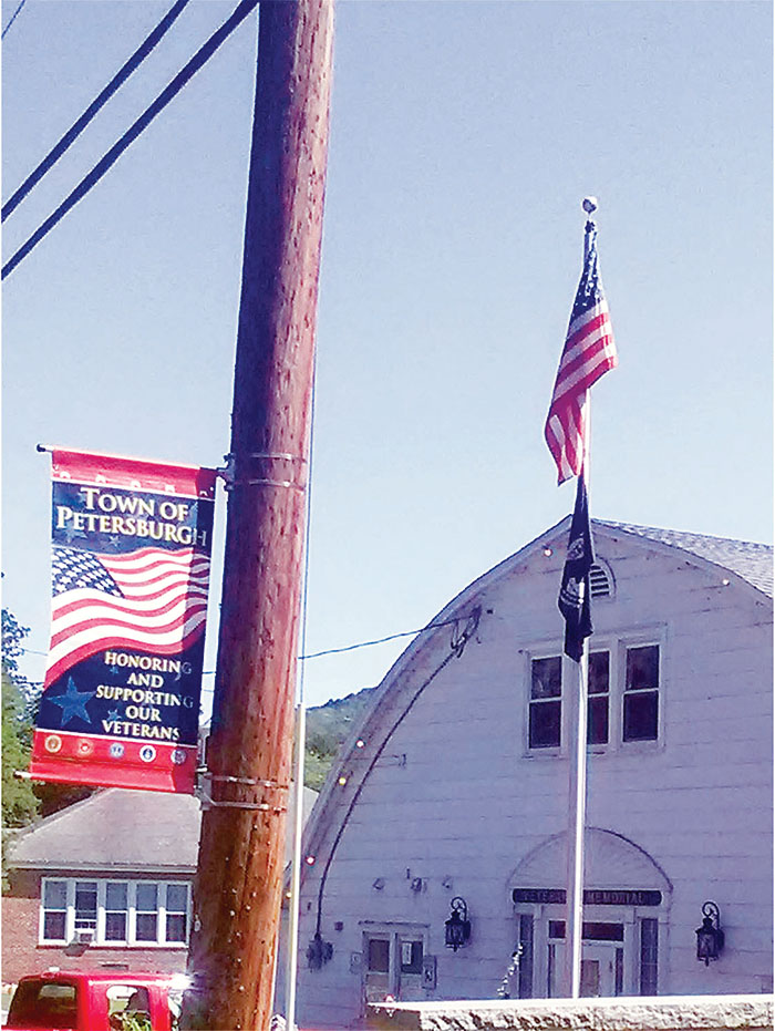 Over the winter these can be stored by the veterans families or be hung in the Petersburgh Veterans Memorial Community Center. To arrange a flagpole hanging, contact the Highway Supervisor Ray Harrison at 518-658-3541. Banners for Veterans can be purchased through the Taconic Valley American Legion, by contacting Chris Lecce at 865-322-0551.