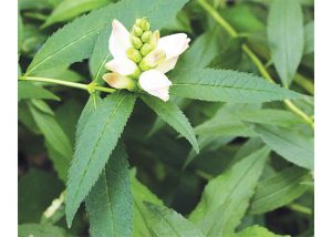 The two-lipped flowers are said to look like tortoise heads. Both the flowers and leaves have been used medicinally.