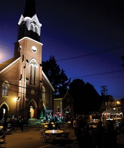 Block Party host Father Tom Zelker joined a large circle of dancers to do the Hokey Pokey after introducing folks who have been involved in keeping the church front and center in the minds of people who had the fate of the church in their decisions, and the rebirth of the church building. It was an enjoyable and pleasant evening for everyone who attended. Photo by Steve Bradley.