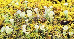 Cup Lichens (Cladonia chlorophaea) may be used by tiny fairies in our woods to quench their thirst The cups stand one-quarter to one-half inch high and must be handled with care.