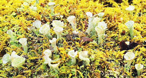 Cup Lichens (Cladonia chlorophaea) may be used by tiny fairies in our woods to quench their thirst The cups stand one-quarter to one-half inch high and must be handled with care.