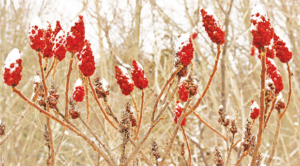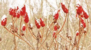 The native Staghorn Sumac tree (Rhus typhina). The plant has furry red fruit and stems.
