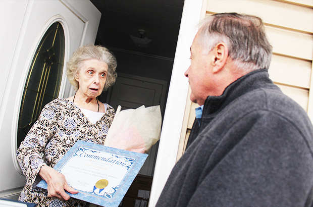 For her part, Ms. Ostrander was quite surprised when she opened the door at her 88 Central Avenue home. Not only did the county officials deliver her mid-day meal, but served up a bouquet of flowers and a certificate for her to boot.