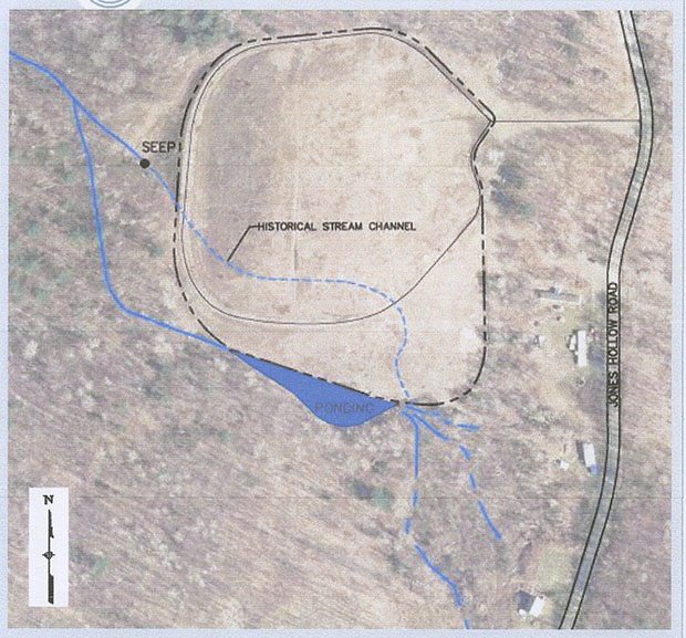 He said the place where the seep is coming out of the landfill at the bottom end is where there used to be a stream before the landfill was there. The perimeter drainage system was supposed to divert the water around the landfill to keep it from flowing through the garbage and becoming contaminated, but the perimeter drainage system is not working properly. He said the area where the stream flows towards the landfill at the upper end has been ponding because the flow is impeded in the ditch which is supposed to carry the water around the perimeter of the landfill. As a result the ground there is saturated and at least some of the water coming into that area from the stream is finding its way into the landfill and running down the historical stream channel.