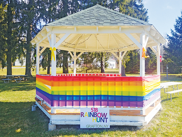 There was a rumor that leprechauns had been busy decking the gazebo in the Grafton Town Park this past weekend, bringing the 518 Rainbow Hunt message of Hope during this time of COVID-19 to the forefront for all to see. The Eastwick Press looked into this, and found it was not leprechauns at all, but the work of two town residents, Amy Reger and Madonna Crandall Roy, with a little help from Amy’s husband Rich.