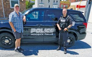 Hoosick Falls Village Police Officer Cory Wagner was sitting in his patrol car last Thursday morning, June 11, when around 8:30 am he noticed a man collapsed at the corner of Wood Park Lane and Main Street. Officer Wagner immediately ran to his side and started CPR. He was soon joined by Town of Hoosick Supervisor Mark Surdam, and together they worked to revive the victim for about three minutes until Emergency Medical Service personnel arrived and took over.