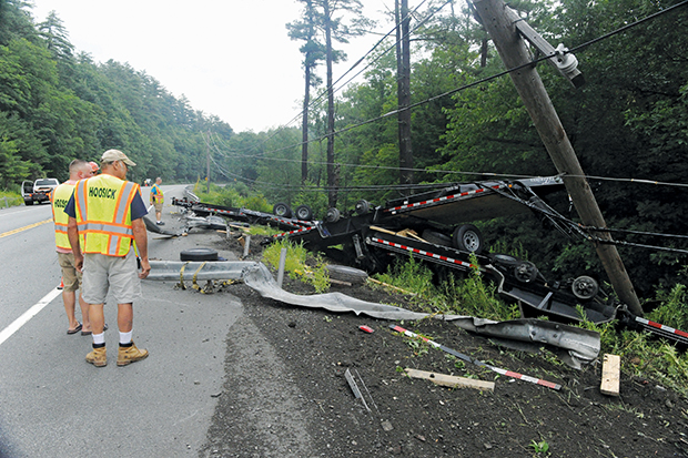 A trailer carrying several trailers separated from its tow vehicle on Thursday morning, July 23, just east of the Man of Kent and hit a power pole, tipping the pole. The vehicle, traveling eastbound, was halfway around the corner when the trailer “jackknifed” according to the driver. The trailers, two or three stacked on top of the bottom trailer, hit the guardrails and rolled on the bank.