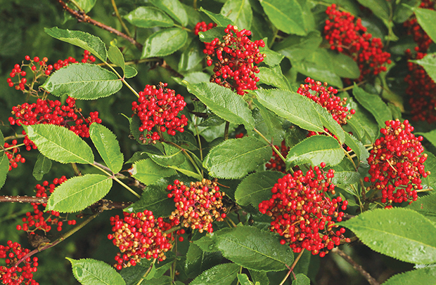 American Red Elderberry (Sambucus racemosa) is now with ripe red berries.