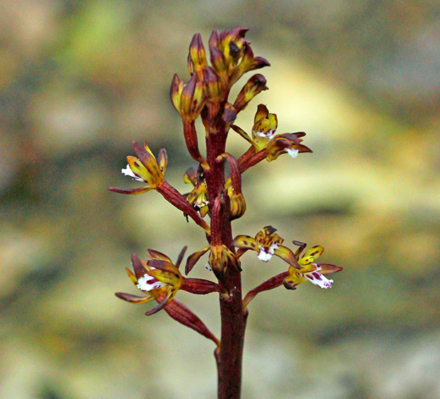 Eastern Spotted Coralroot (Corallorhiza maculata) is a native plant that is extremely rare in Rensselaer County, according to local scientist Dr. David Hunt.