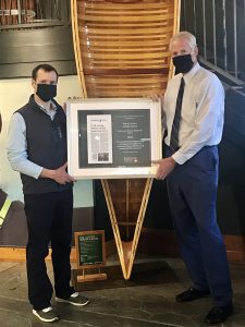 Simon Perkins, president of the Orvis Company, a luxury clothing retailer with headquarters in Arlington, VT, accepted a gift of appreciation from Tom Dee, president and CEO of Southwestern Vermont Health Care (SVHC) for contributions of more than 750 masks during the early months of the COVID-19 pandemic.