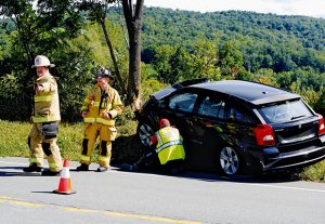 A vehicle headed east on Route 7 in Hoosick veered off the road and into a tree Monday when the driver came upon a car stopped in the traffic lane waiting to pull into Lumberjack’s coffee shack.