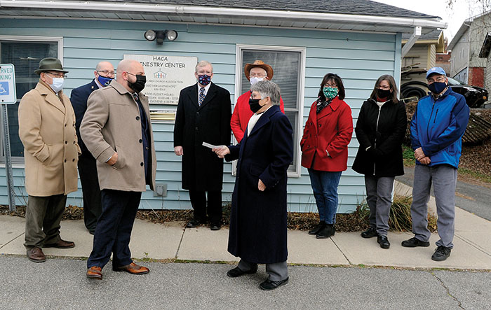 Peter Rivenburg, Master the Van Rensselaer Masons of Hoosick Falls, front left, passes a $5,000 check to Dianne Hosterman of the Hoosick Area Church Association.