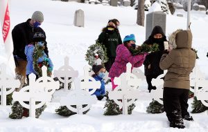 Caption: Volunteers with “Wreaths Across America” place wreaths in Memorial Park. Photo by Steve Bradley