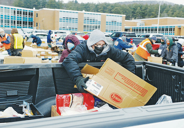 On Wednesday, January 6, the food giveaway returned to the HFCS parking lot and as one can see from the picture, again there was quite a need for the meat, fresh vegetables, canned goods and other staples. Volunteers from all around the area, many supplied by the Hoosick Area Churches Association began loading vehicles at noon, although cars were lined well before the start time. According to Wesley Parrott of Catholic Charities, some of the funding for these events comes from a grant that is used to purchase food from local farmers, helping them out as well.