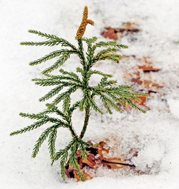 Flat-branched Tree Clubmoss (Dendrolycopodium obscurum) is not a moss, but rather an evergreen plant native to the eastern U.S. Usually standing six inches tall, it grows in colonies spread by stems underground. Today’s clubmosses are similar to those found in fossil records dating back 390 million years.