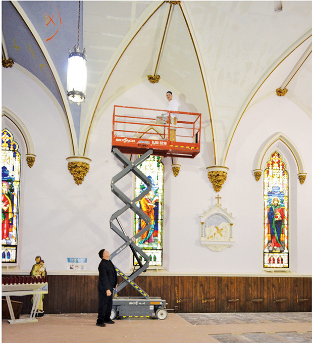Fr. Tom Zelker talked a minute with Keith Potten who was busy smoothing over a portion of the test area of the newly installed ceiling board in some of the rounded sections of Immaculate Conception Church in Hoosick Falls. The testing seemed to be going well. Putting ceiling board over the current ceiling and bolting it to the wooden beams above has turned out to be the most financially feasible way to go, said Fr. Tom. Paint chips from fallen portions of the ceiling will be used to match the current colors.