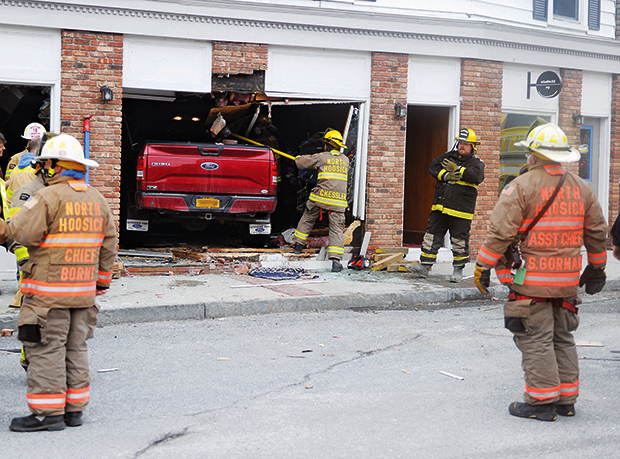 Hoosick Falls Police responded to a report of a vehicle into a building on Classic and Main Streets in the Village on Wednesday, March 3 at about 2 pm. The investigation determined that a pickup truck driven by a 59-year-old male struck a parked car and pushed the vehicle about 270 feet into a building causing extensive damage to the cars and the structure.