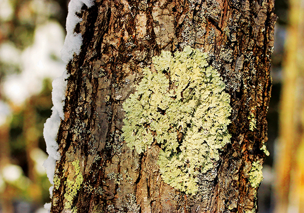 The Common Greenshield Lichen (Flavoparmelia caperata) usually grows on the bark of trees. Lichens are classified in the fungi kingdom. It is estimated that six to eight percent of earth’s surfaces are covered in lichens. There are some 20,000 species.