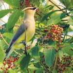 This Cedar Waxwing bird (Bombycilla cedrorum) is eating the berries from a Red Elderberry bush (Sambucus racemosa) on a Petersburgh lawn near the edge of the woods. [Read more…] about Outdoors With Trix